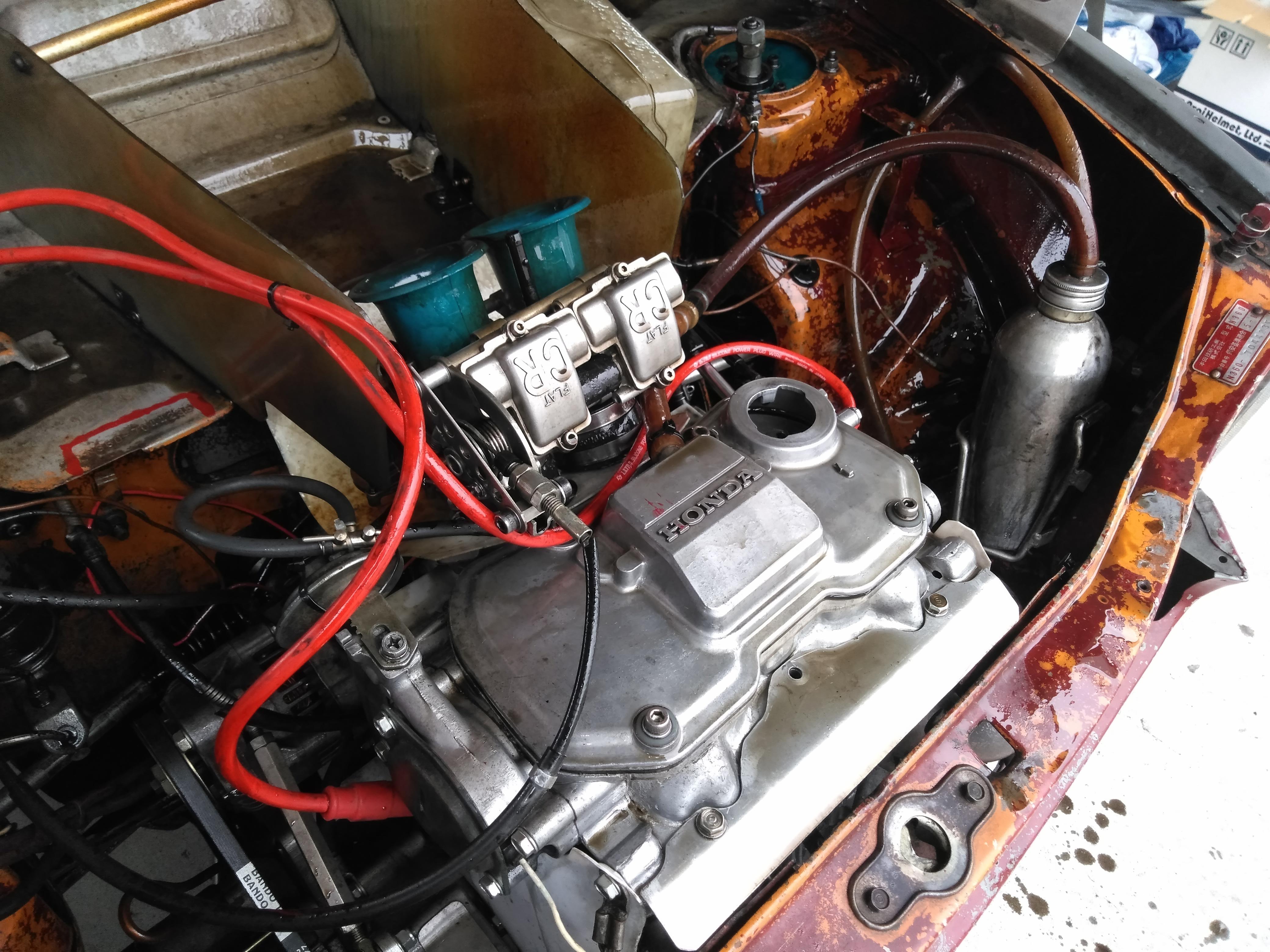 スタッフがオイルスモークが酷いのでオレンジボール出しましたと告げられ、ボンネットを開けるとオイルまみれ。なんとオイルフィラーキャップが脱落していました。