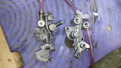 翌日、車の下がオイルまみれ!オイルポンプから漏れていました。仕方がないのでタイから持ってきたこのポンプと搭載してあったエンジンのポンプ、オーバーホールしたエンジンに付いていたポンプの三個から良いとこ取りを覚悟してオーナーさんに連絡したところ、形は違うけど新品が有るのよとのお話。他の整備工場で形状が違うから取り付けられないと言われたそうですが、内部パーツでも使えればと持ってきていただきました。左がタイ、右が新品。